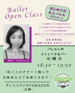 【バレエ入門クラス:4月から始まります!】 バレエ初心者のためのクラスです。バレエがまったく初めての方からご受講いただけます。 バレエの基本ポジション、からだの使い方、アームスの使い方、呼吸、バレエ用語、など、 バレエレッスンに欠かせない大切な基礎を学んでいきます。 ゆっくりと進めていきますので、初心者の方も安心してご受講ください。 講師:米村ひかる 熊本県出身。3歳よりタカコバレエスタジオにてバレエを始める。中西隆子に師事。 2002年より上京し川口ゆり子バレエスクールに入学。 今村博明、川口ゆり子に師事。 2004年にバレエ・ シャンブルウエストに入団しほぼ全ての演目、公演に出演する。 2019年にバレエ・シャンブルウエスト退団。 拠点を福岡に移しバレエ講師として活動中。